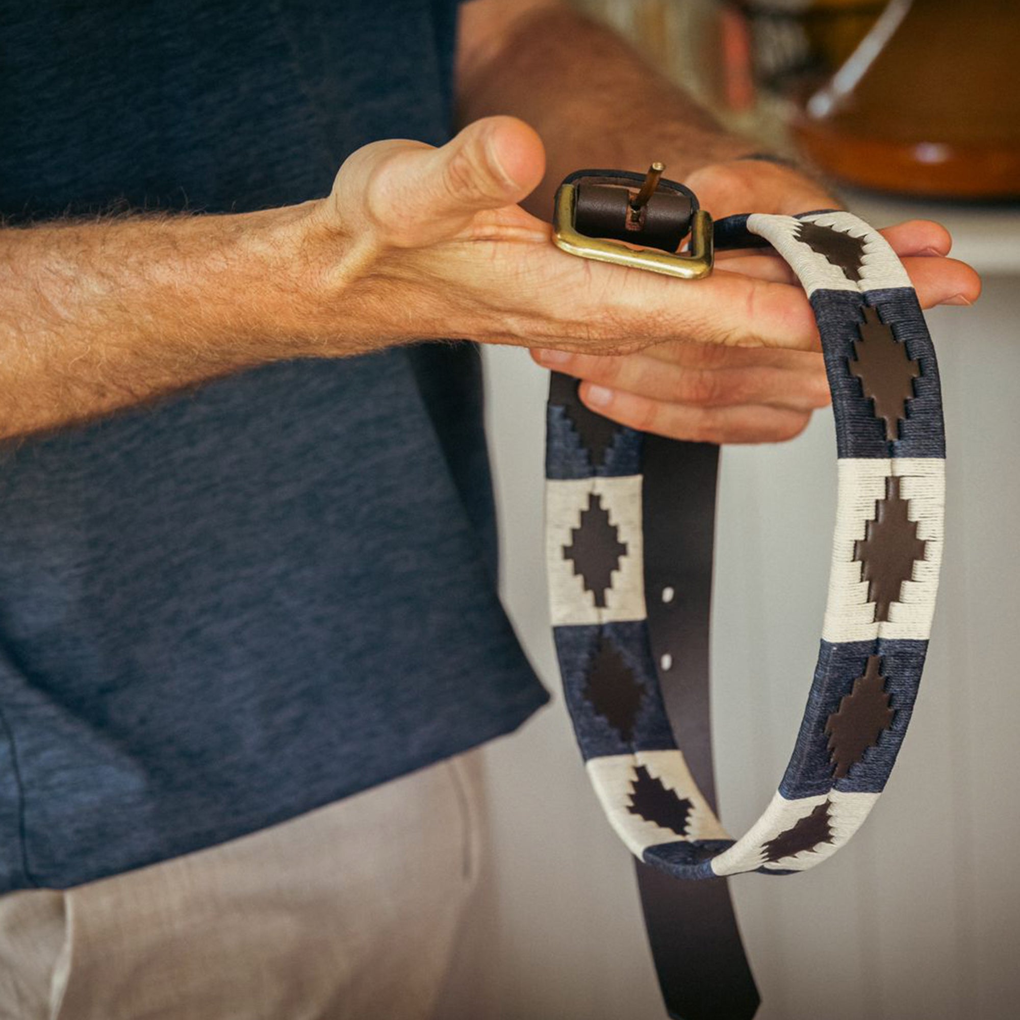 The Jugadoro pampeano belt is a popular choice with a very stately design featuring nautical colour-blocking. Each pampa design is made up of individual threads that have been precisely hand-stitched by our master artisans.
